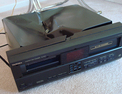 As you can see from the picture, some of the CD player has melted. Thanks to my 2 months experience as a volunteer firefighter, my instincts kicked in and I was able to extinguish the flames with my coffee before too much of the CD player melted. It still can hold about 33-35 CDs, and all that stuff that melted on the right side wasn't important anyway.